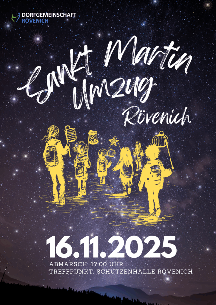 Der traditionelle Sankt Martins Umzug in Rövenich ist jedes Jahr ein besonderes Highlight für Groß und Klein. Mit leuchtenden Laternen, stimmungsvoller Musik und der Geschichte des Heiligen Martin ziehen wir gemeinsam durch das Dorf. Ein festliches Feuer und ein Wecken für die Kinder runden den Abend ab – ein Erlebnis, das verbindet!