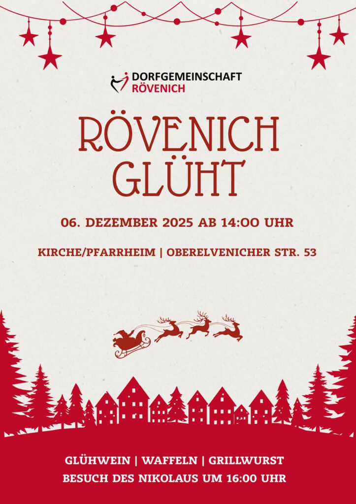 Gemütlichkeit pur bei „Rövenich glüht“! Freuen Sie sich auf ein winterliches Beisammensein mit Glühwein, Kinderpunsch und leckerem Essen. In stimmungsvoller Atmosphäre genießen wir gemeinsam die kalte Jahreszeit – ein Highlight für die ganze Dorfgemeinschaft!